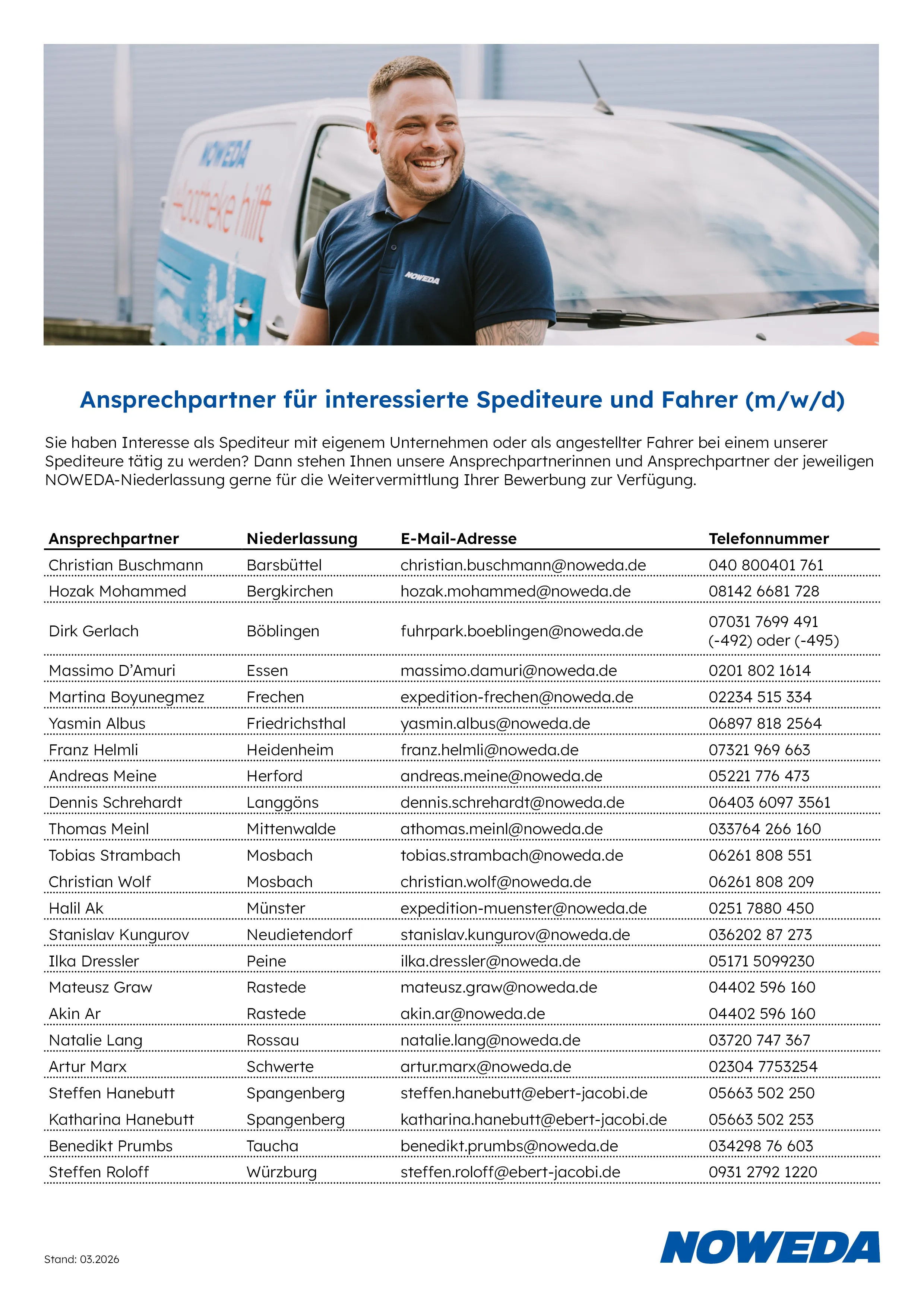 Sie lieben die Straße, Logistik liegt Ihnen im Blut und Sie möchten in einem starken Netzwerk mitwirken? Wir bieten Ihnen die Möglichkeit, Teil unseres erfolgreichen Transportnetzwerks zu werden. Ob als Spediteur mit eigenem Unternehmen oder als angestellter Fahrer bei einem unserer Spediteure - bei uns sind Sie richtig, wenn Sie mit Leidenschaft und Zuverlässigkeit die Lieferkette der NOWEDA unterstützen möchten.